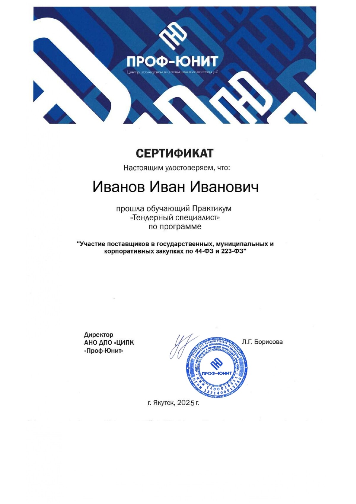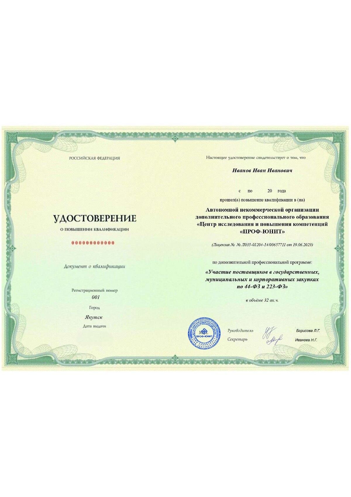 - Выдача удостоверения повышения квалификации по программе: «Участие поставщиков в государственных, муниципальных и корпоративных закупках по 44-ФЗ и 223-ФЗ)